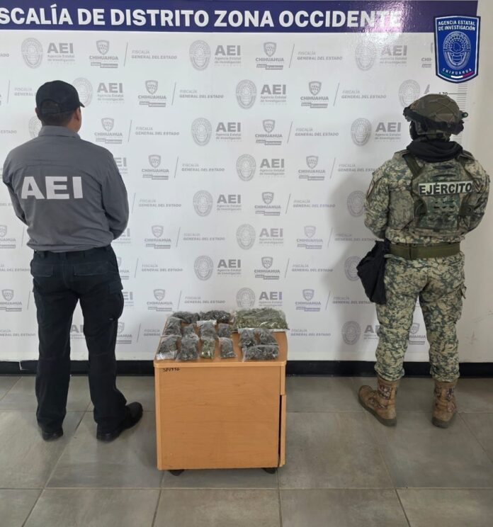Elementos de la Agencia Estatal de Investigación y elementos del Ejército Mexicano, encontraron droga en el interior de un vehículo que fue abandonado en las calles Leyes y Topografía de la colonia Ingenierías, en la ciudad de Cuauhtémoc.