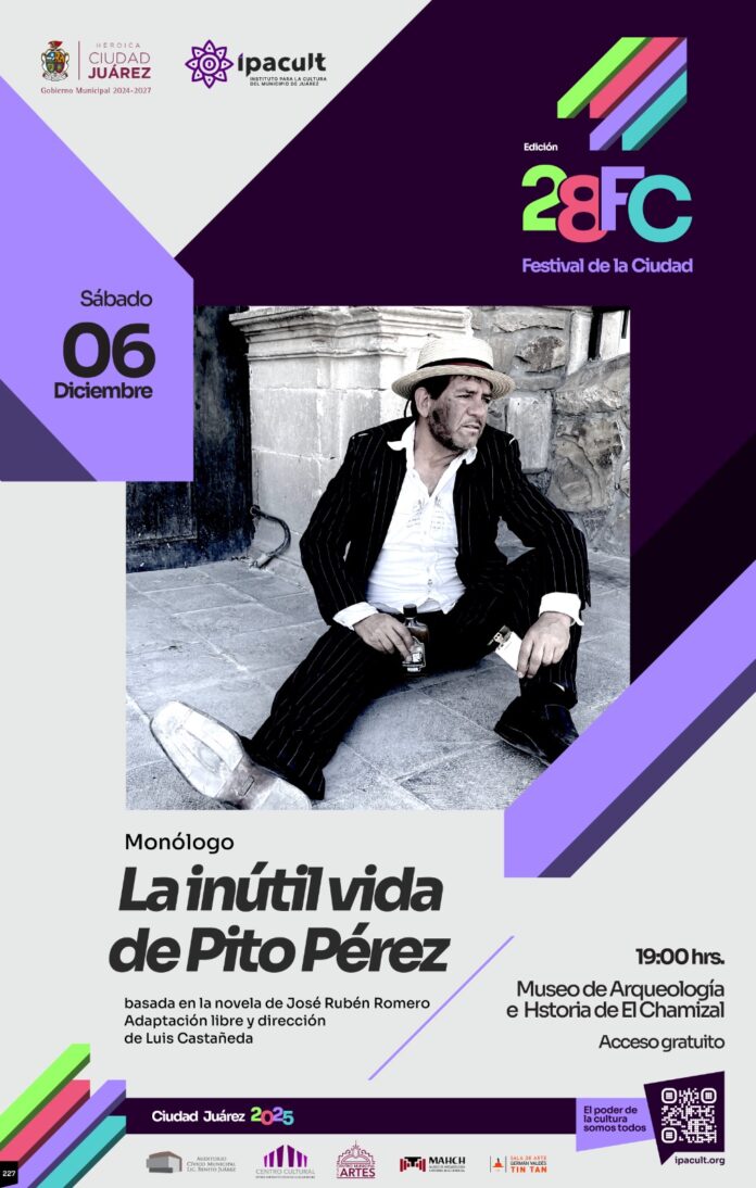 El Instituto para la Cultura del Municipio de Juárez (IPACULT) invita a la ciudadanía a disfrutar del monólogo “La vida inútil de Pito Pérez”, que formará parte de la edición 28 del Festival de la Ciudad, con motivo de los 366 años de la fundación de Ciudad Juárez y que busca ofrecer a los asistentes una experiencia única en el Museo de Arqueología e Historia de El Chamizal (MAHCH).