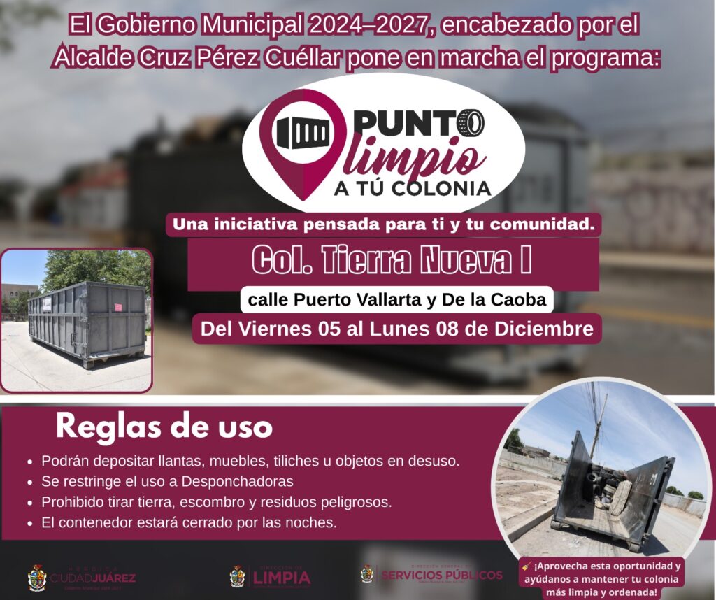 La Dirección de Limpia habilitó desde ayer cuatro nuevos Puntos Limpios a tu Colonia en distintos sectores de la ciudad, con el objetivo de facilitar a los juarenses la disposición adecuada de residuos voluminosos o de difícil manejo.