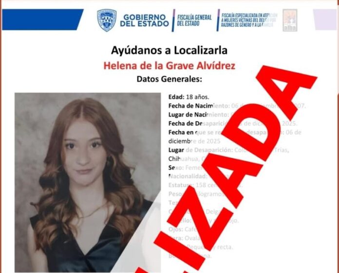 La Fiscalía Especializada en Atención a Mujeres Víctimas del Delito por Razones de Género y a la Familia, localizó sana y salva a Helena D. A., de 18 años, que contaba con reporte de ausencia en la ciudad de Chihuahua.