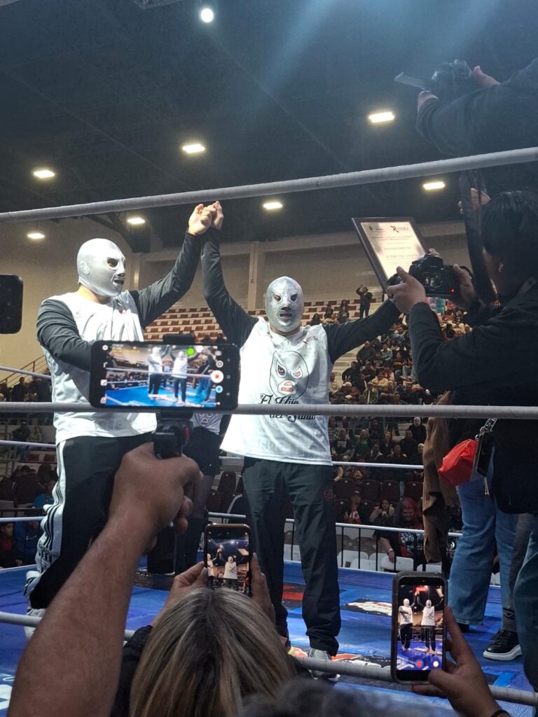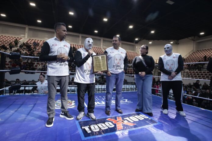 “Seguramente aquí hay tres generaciones; muchos de ustedes eran niños cuando cuando yo vine por primera vez y ahora vienen con sus hijos y quizá con sus nietos y solo puedo decir: ‘gracias Ciudad Juárez, gracias afición por su cariño y aquí es un honor despedirme”, dijo el Hijo del Santo quien estuvo acompañado por el Hijo del Santo Jr, el director del Instituto Municipal del Deporte, Juan Carlos Escalante Suárez y la regidora coordinadora de la Comisión Edilicia del Deporte y Cultura Física, Karla Michaeel Escalante Ramírez.
