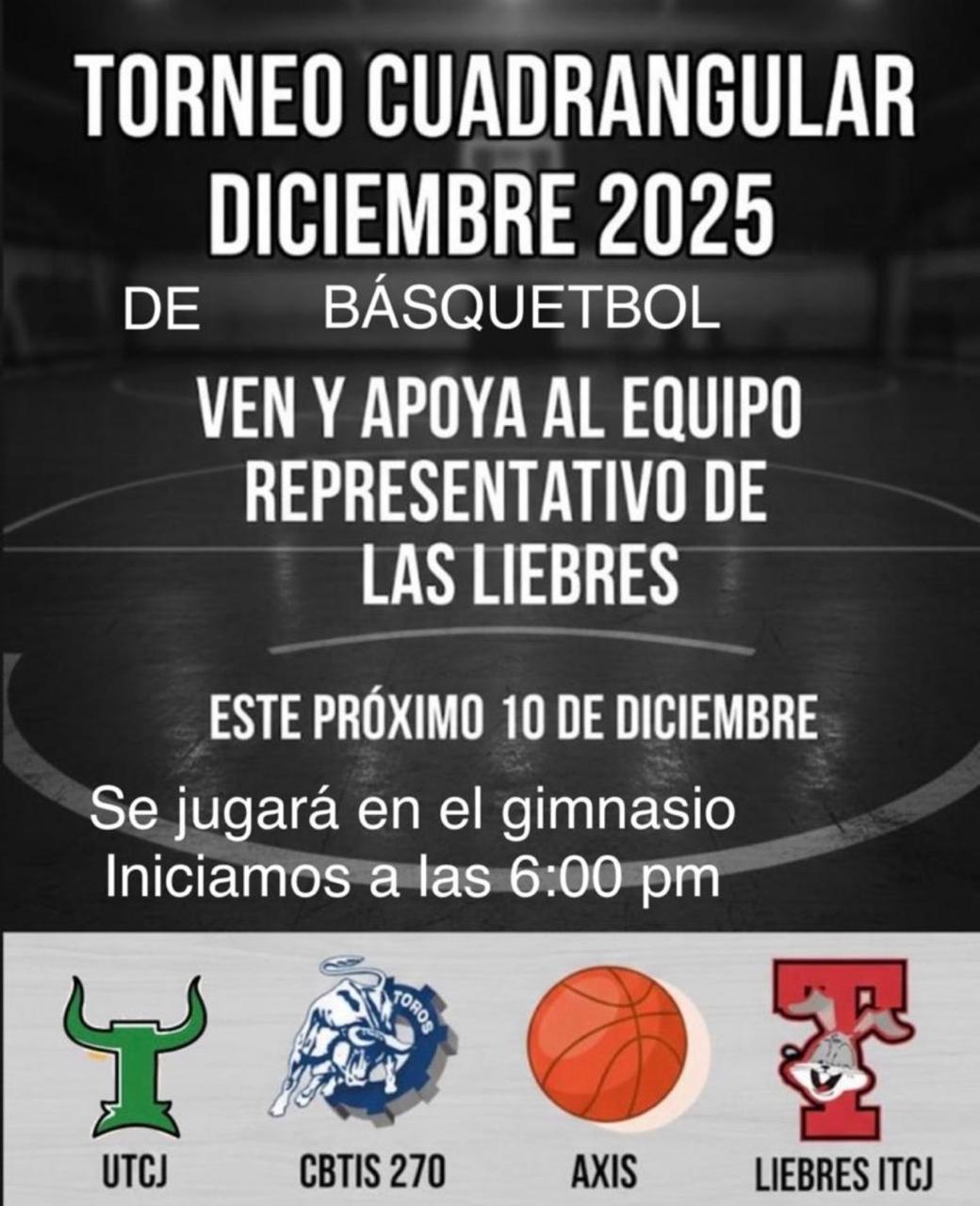 Este martes fue anunciado el Torneo Cuadrangular Navideño 2025 de Basquetbol organizado por el Tecnológico Nacional de México campus Instituto Tecnológico de Ciudad Juárez (TecNm-ITCJ) , el cual se estará efectuando en la duela del gimnasio de las Liebres a partir de mañana 10.