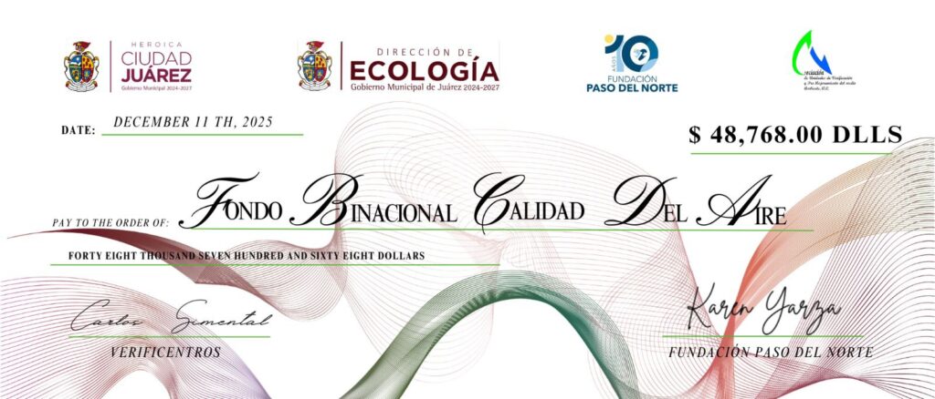 Díaz Gutiérrez dijo también que en el marco de esta reunión se hizo la entrega simbólica de un cheque por la cantidad de 48 mil 768 dólares, cantidad que se reunió por la aportación de 5 pesos por engomado ecológico por los miembros de la Asociación de Verificentros de Ciudad Juárez, recurso que se destinará para el fondo binacional de calidad del aire y que se utiliza en el funcionamiento y mantenimiento de la red de monitoreo ambiental.