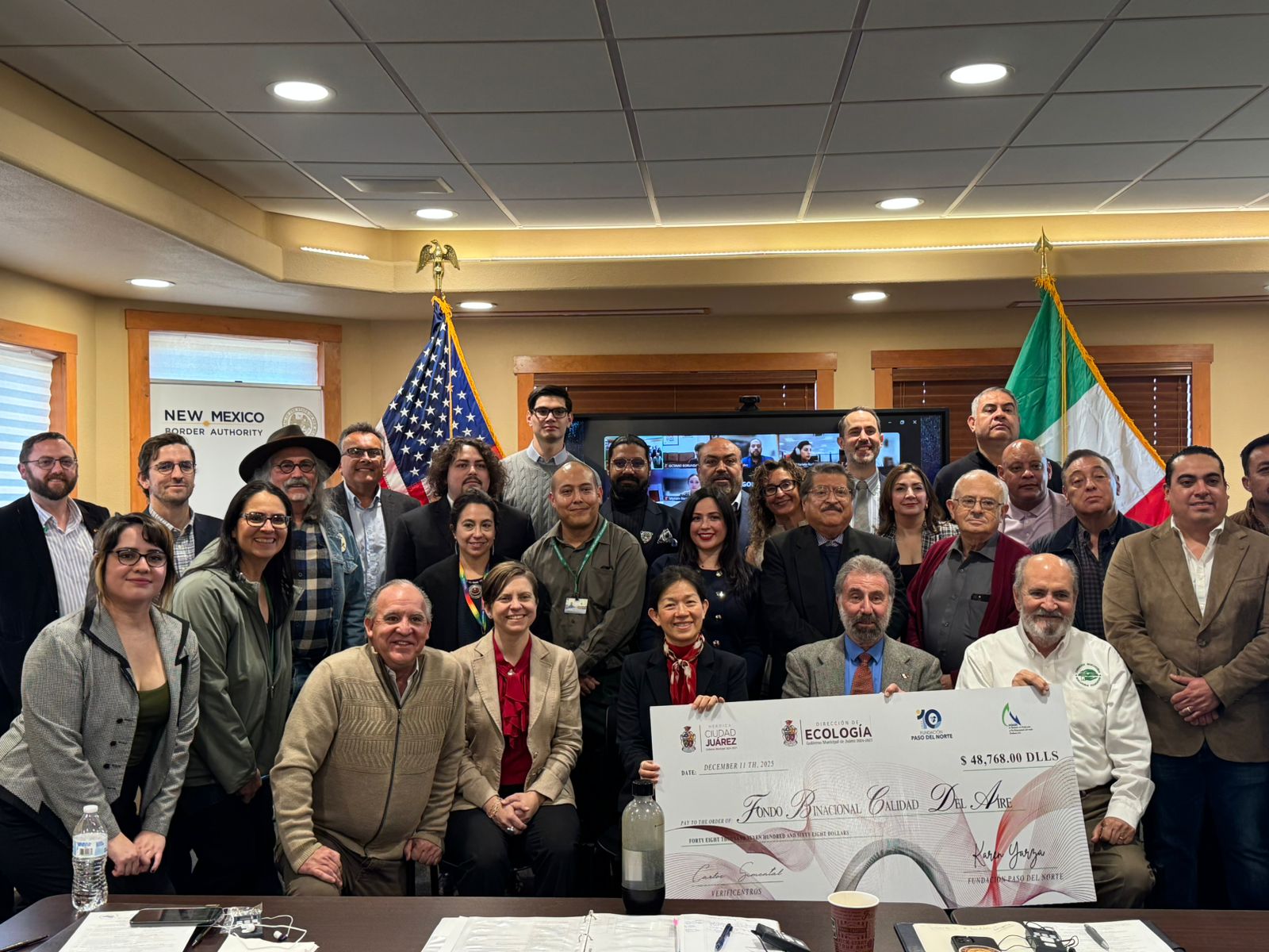 Díaz Gutiérrez dijo también que en el marco de esta reunión se hizo la entrega simbólica de un cheque por la cantidad de 48 mil 768 dólares, cantidad que se reunió por la aportación de 5 pesos por engomado ecológico por los miembros de la Asociación de Verificentros de Ciudad Juárez, recurso que se destinará para el fondo binacional de calidad del aire y que se utiliza en el funcionamiento y mantenimiento de la red de monitoreo ambiental.