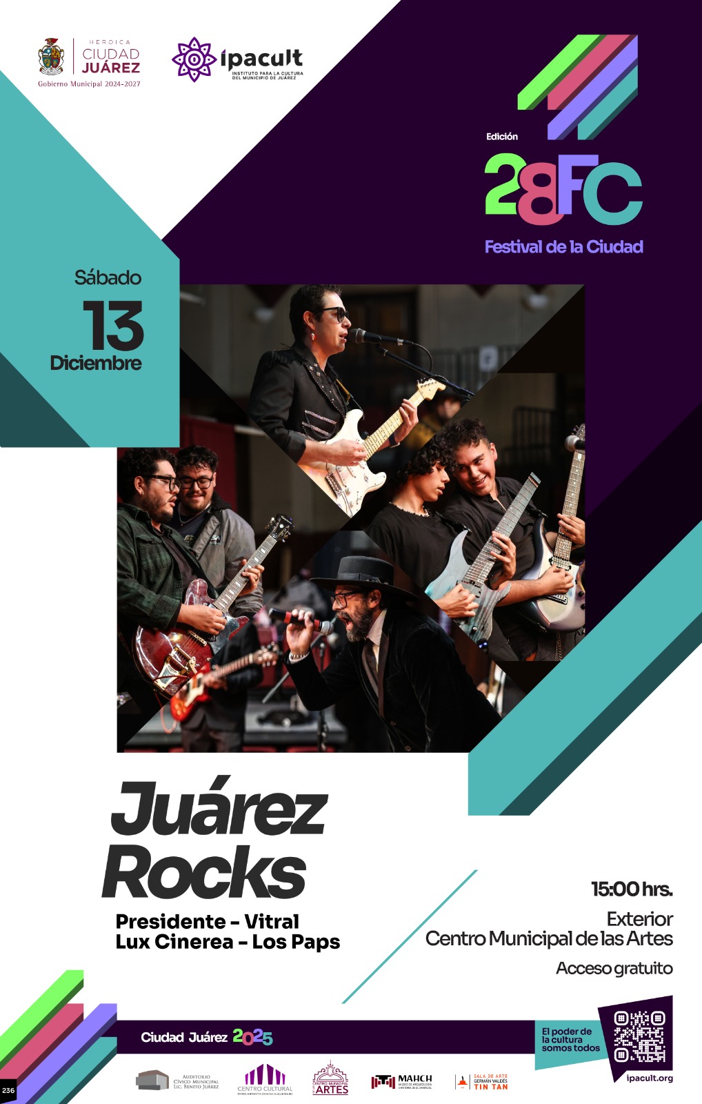 El ritmo y la tradición rockera de Ciudad Juárez volverán a encender el Centro Histórico con el evento “Juárez Rock”, programado para este sábado 13 de diciembre a las 3:00 de la tarde en el exterior del Centro Municipal de las Artes (CMA), como parte de la vigésima octava edición del Festival de la Ciudad.