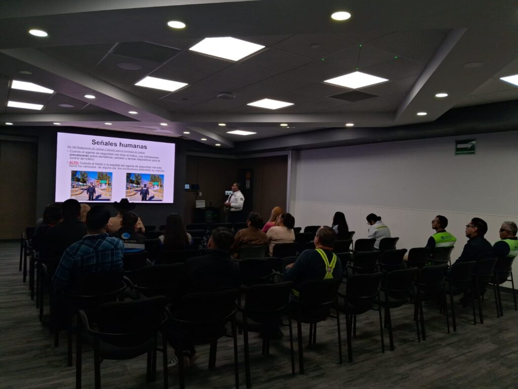Agentes de la Coordinación General de Seguridad Vial impartieron una plática sobre manejo defensivo en las instalaciones de la maquiladora Ethicon, planta Independencia, con el propósito de fortalecer la seguridad vial entre los empleados.