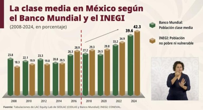 El 39.6% de la población mexicana pertenece actualmente a la clase media, un aumento histórico de 12.4 puntos porcentuales entre 2018 y 2024, de acuerdo con el más reciente informe sobre pobreza y equidad del Banco Mundial, informó Jesús Ramírez Cuevas, coordinador de asesores de la Presidencia.