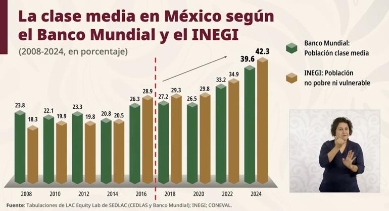 Durante La Mañanera del Pueblo, Ramírez Cuevas explicó que el Banco Mundial define como clase media a quienes perciben ingresos superiores a 17 dólares diarios (alrededor de 340 pesos), mientras que considera en pobreza a quienes ganan menos de 8.30 dólares al día (aproximadamente 166 pesos). Bajo estos criterios, México —junto con Brasil— es el país de América Latina donde más creció la clase media en el periodo reciente.