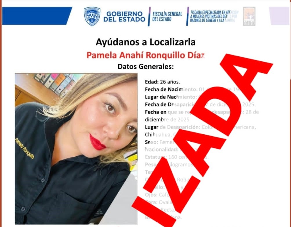 La pronta activación del Protocolo Alba instrumentado por la Fiscalía Especializada en Atención a Mujeres Víctimas del Delito por Razones de Género y a la Familia, permitió localizar sana y salva a Pamela Anahí R. D., quien contaba con reporte de ausencia en la ciudad de Chihuahua.