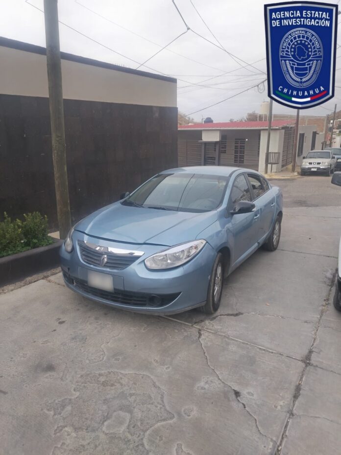 Elementos de la Agencia Estatal de Investigación adscritos a la Fiscalía de Distrito Zona Sur, en el municipio de Parral, recuperaron un vehículo de la marca Renault, línea Fluence, modelo 2011, color azul, que contaba con reporte de robo