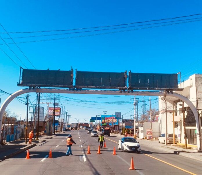 La Coordinación General de Seguridad Vial, a través del área de Control de Tráfico, realizó trabajos de pintura para la división de carriles sobre la avenida Waterfill, hacia el Puente Internacional Zaragoza.