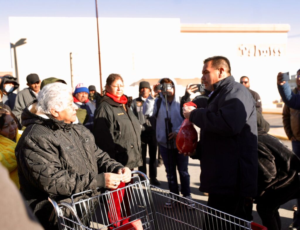 El Presidente Municipal, Cruz Pérez Cuéllar, encabezó la entrega de 100 piernas de cerdo a parqueros y empacadores que laboran en un centro comercial ubicado entre la avenida de Las Torres y el Libramiento, como un apoyo directo a su economía familiar.