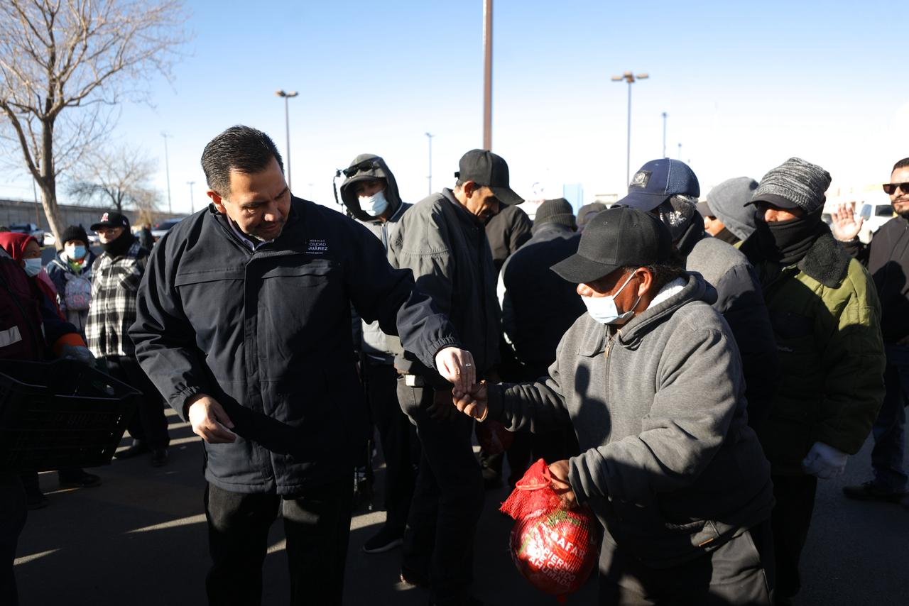 El Presidente Municipal, Cruz Pérez Cuéllar, encabezó la entrega de 100 piernas de cerdo a parqueros y empacadores que laboran en un centro comercial ubicado entre la avenida de Las Torres y el Libramiento, como un apoyo directo a su economía familiar.