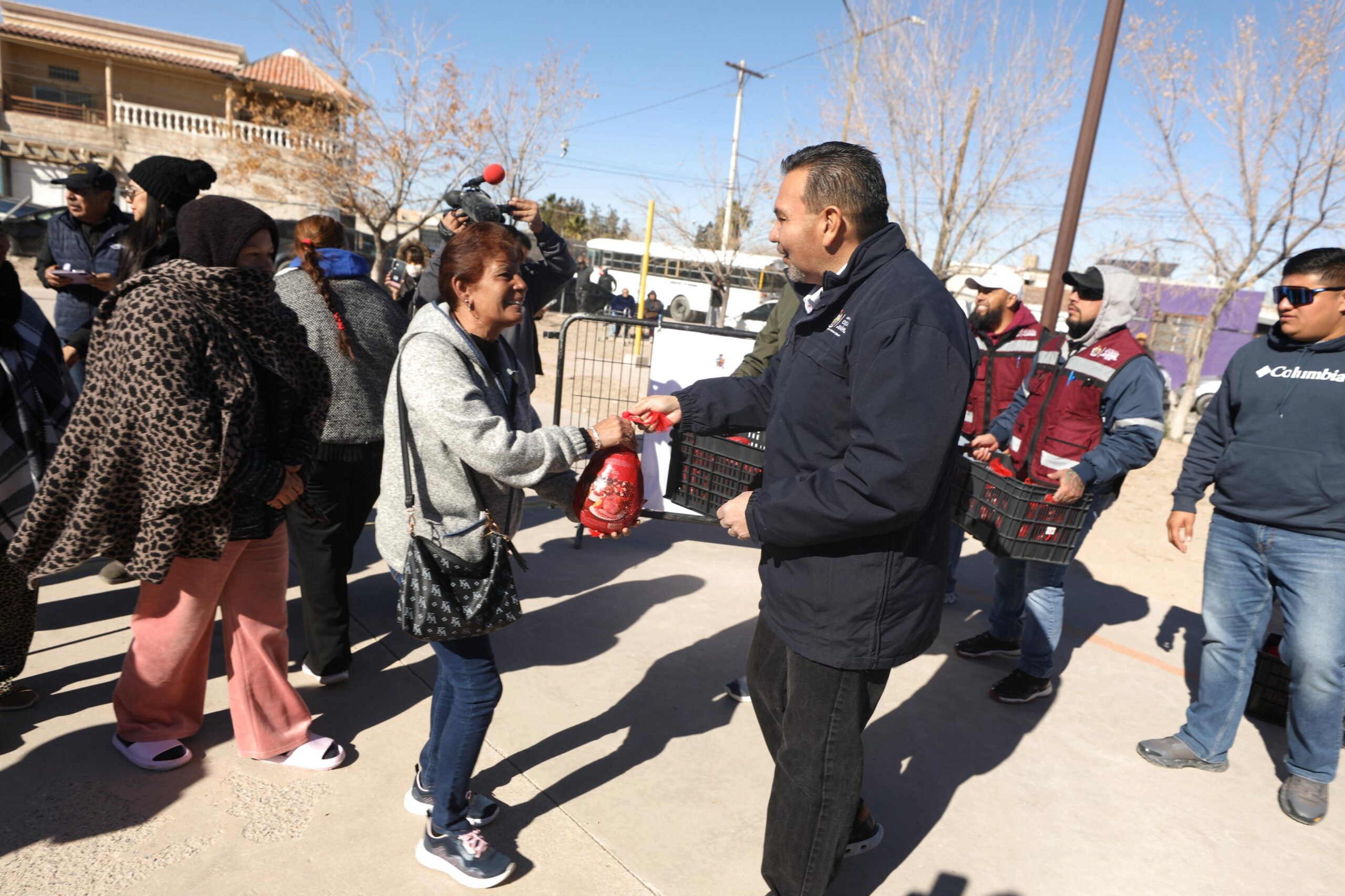 El Presidente Municipal, Cruz Pérez Cuéllar, convivió esta mañana con vecinas y vecinos de la colonia Águilas de Zaragoza, a quienes además entregó 350 piernas de cerdo como apoyo directo a la economía familiar durante la conocida “cuesta de enero”.