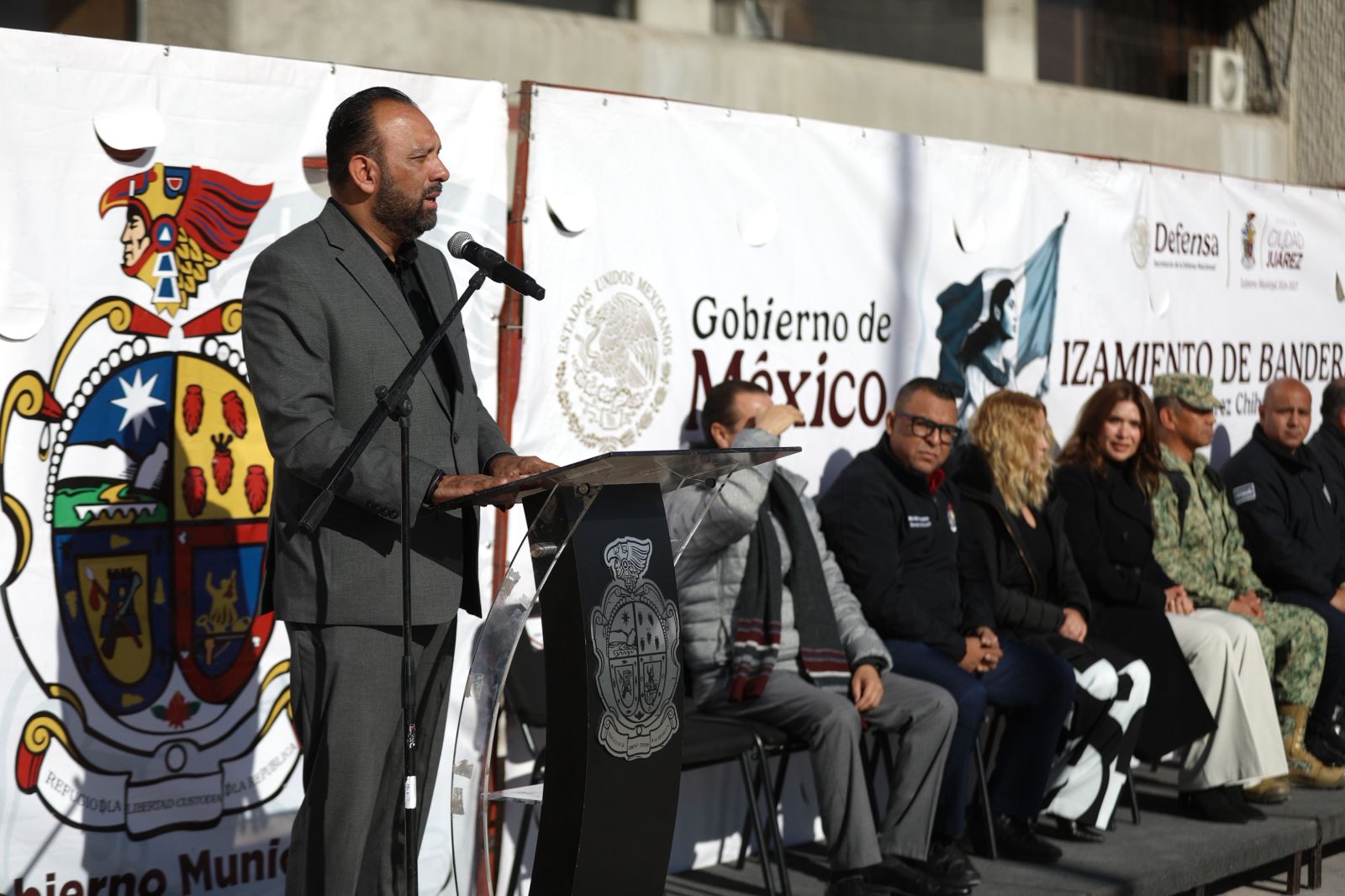 En representación del Presidente Municipal, Cruz Pérez Cuéllar, el secretario expresó el gusto de iniciar habitualmente cada mes con este tipo de honores a la bandera y por ende, promover la unidad de la patria.