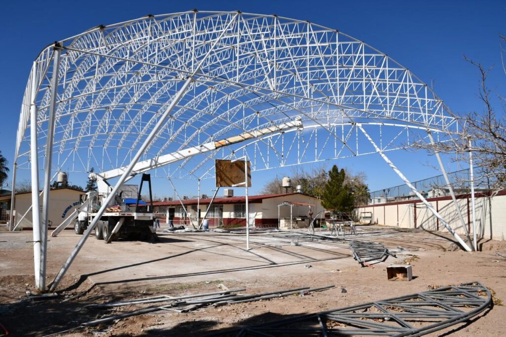 La Dirección General de Obras Públicas trabaja en la construcción de un domo en la Escuela Primaria Ramona Soto de González, ubicada en las calles Benemérito de las Américas, de la colonia Infonavit Casas Grandes.
