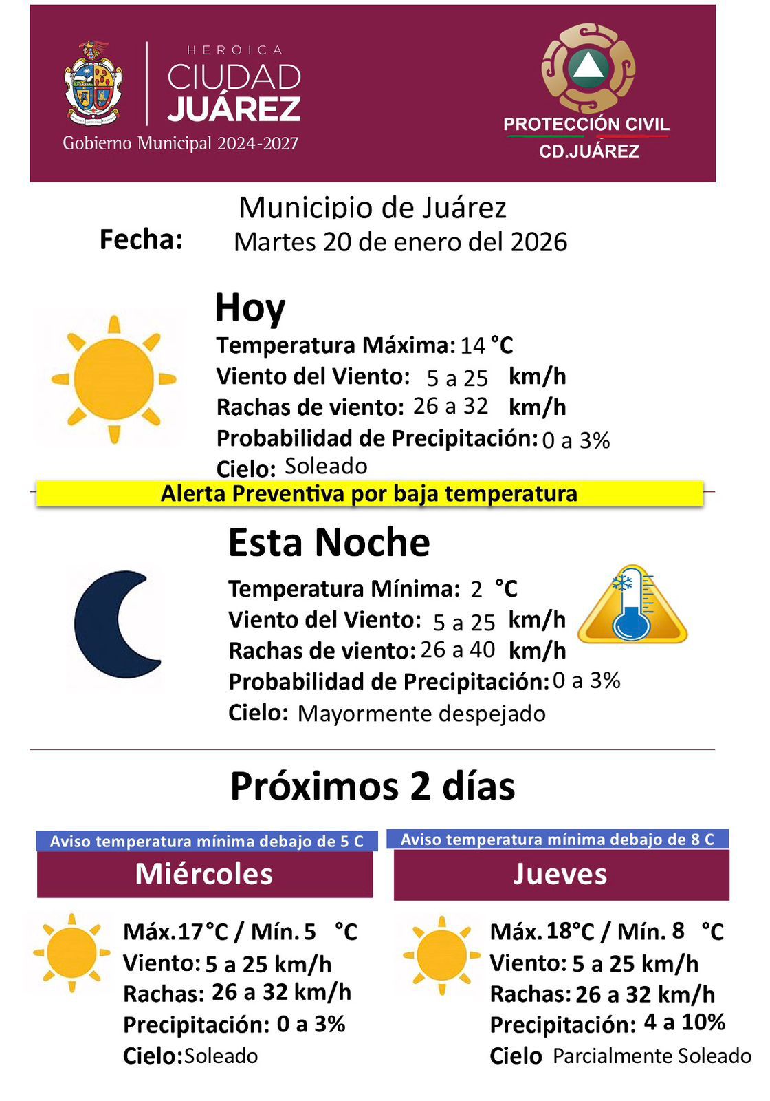 La Dirección General de Protección Civil del Municipio informó el pronóstico meteorológico para este martes 20 de enero, en el que se mantiene activa una alerta preventiva por bajas temperaturas.