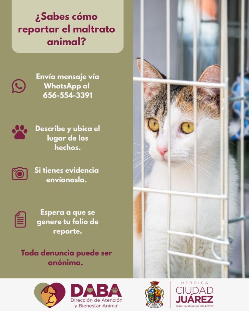 Para hacer un reporte de maltrato animal se debe de mandar un mensaje de WhatsApp al número 656-554-3391, describir y ubicar el lugar de los hechos; enviar evidencia fotográfica o de video y finalmente esperar a que se genere el folio del reporte, toda denuncia que se haga será anónima.