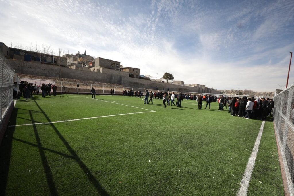 La obra en la Técnica 56 incluye una cancha de fútbol de 30 por 45 metros, con pasto sintético, enrejado perimetral, casetas para jugadores y gradas metálicas con tejabán, lo que representa una inversión de 2 millones 789 mil pesos.