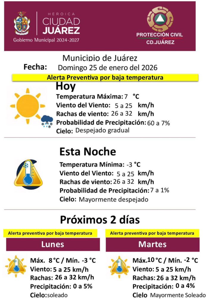 La Dirección General de Protección Civil del Municipio de Juárez informa el pronóstico meteorológico correspondiente al domingo 25 de enero de 2026, el cual se mantiene bajo alerta preventiva por bajas temperaturas.