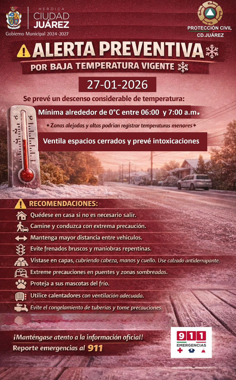La Dirección General de Protección Civil informó que este martes 27 de enero de 2026 continúa vigente la alerta preventiva por baja temperatura en la ciudad, debido a que durante la madrugada y las primeras horas del día se han registrado temperaturas mínimas cercanas al punto de congelación.