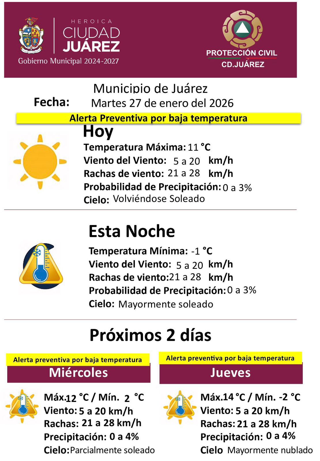 La Dirección General de Protección Civil del Municipio emitió una alerta preventiva por bajas temperaturas para este martes 27 de enero, ante las condiciones climáticas que se registrarán en la ciudad.