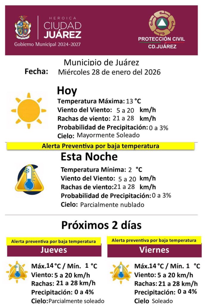 Para los próximos dos días continuará vigente la alerta preventiva por bajas temperaturas. El jueves se espera una temperatura máxima de 12 grados y una mínima de 2 grados centígrados, con vientos de 5 a 20 kilómetros por hora, rachas de hasta 28 kilómetros por hora, probabilidad de precipitación de 0 a 4 por ciento y cielo parcialmente soleado.