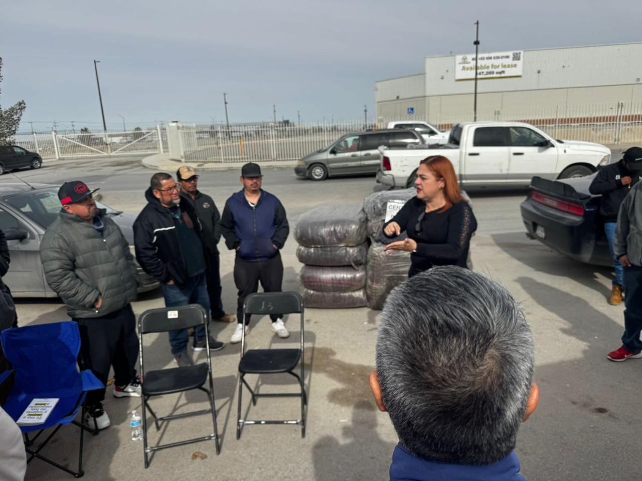 La titular de la Coordinación de Atención Ciudadana, María Antonieta Mendoza, acudió este día a entregar cobijas a los extrabajadores de maquiladoras situadas al suroriente de la ciudad que suspendieron sus operaciones días atrás.