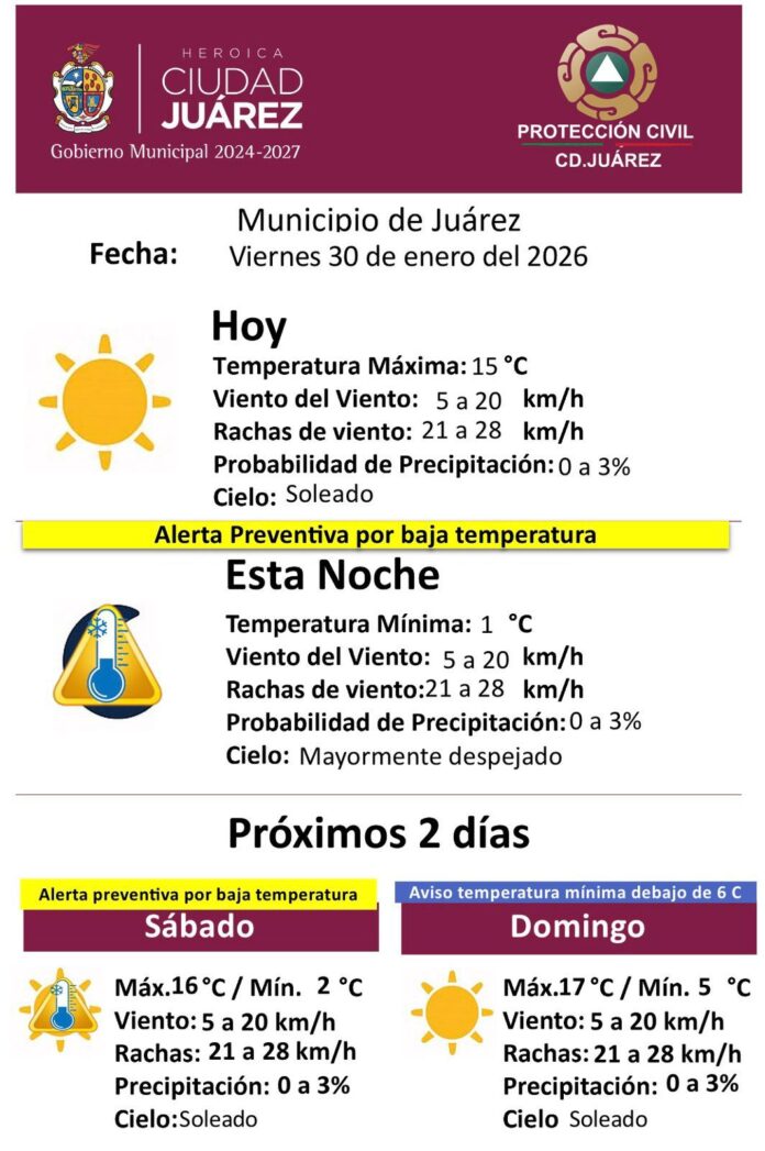 La Dirección General de Protección Civil dio a conocer el pronóstico meteorológico para este viernes 30 de enero de 2026 en el municipio de Juárez, así como un avance de las condiciones previstas para los próximos días, manteniéndose vigente una alerta preventiva por bajas temperaturas.