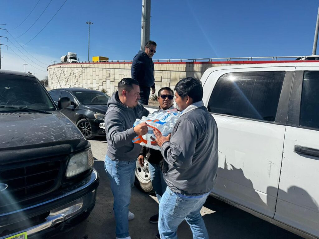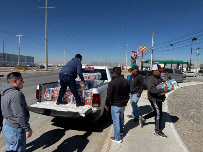 Personal de la Coordinación de Atención Ciudadana, acudió a entregar aguas a ex empleados de maquiladoras situadas al suroriente de la ciudad que suspendieron sus operaciones semanas atrás.