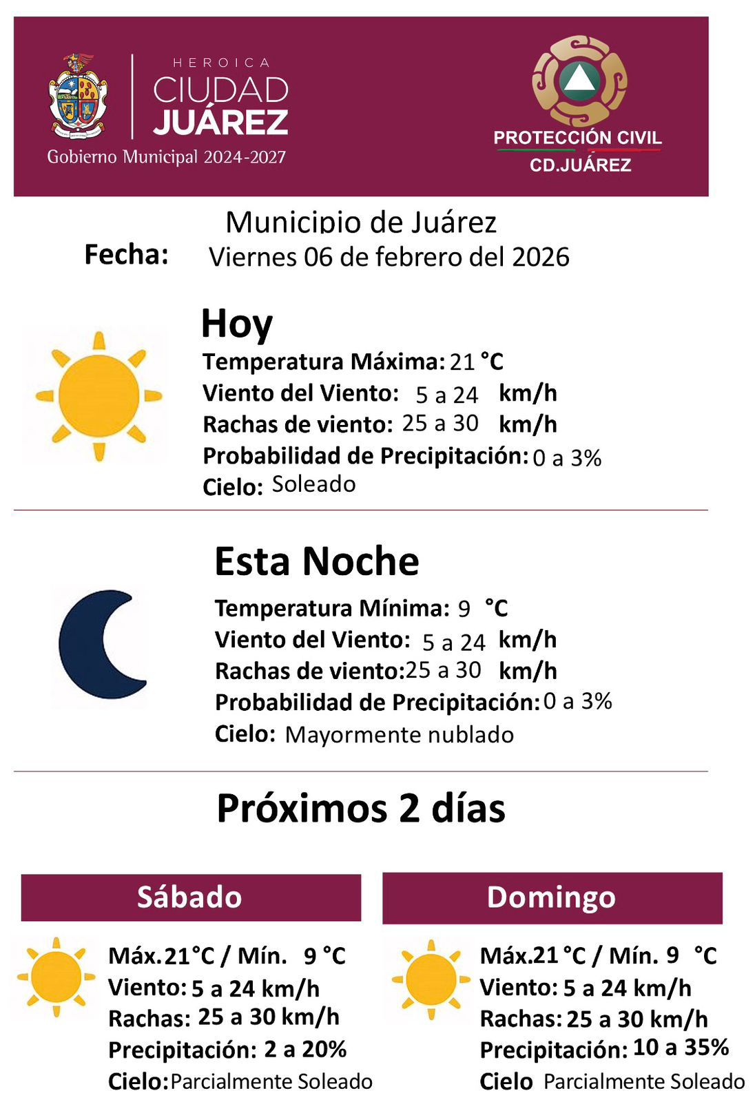 La Dirección de Protección Civil del Municipio informó las condiciones meteorológicas previstas para este viernes 06 de febrero, así como el pronóstico para los próximos días.