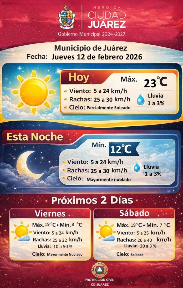 La Dirección General de Protección Civil del Municipio dio a conocer el pronóstico del clima para este jueves 12 de febrero, en el que se prevé una temperatura máxima de 23 grados centígrados y condiciones de cielo parcialmente soleado.