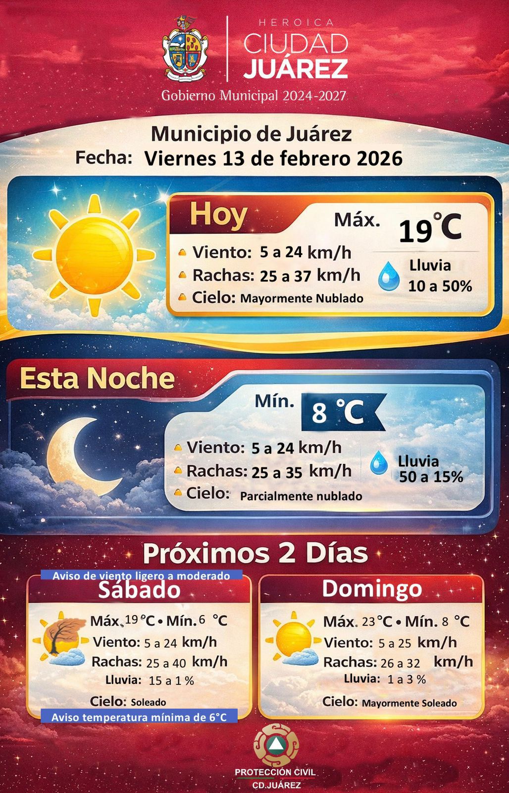 La Dirección General de Protección Civil del Municipio informó que para este viernes 13 de febrero se pronostica una temperatura máxima de 19 grados centígrados en Ciudad Juárez, con cielo mayormente nublado y vientos de 5 a 24 kilómetros por hora, así como rachas que podrían alcanzar entre 25 y 37 kilómetros por hora. La probabilidad de lluvia se mantiene entre el 10 y el 50 por ciento durante el día.