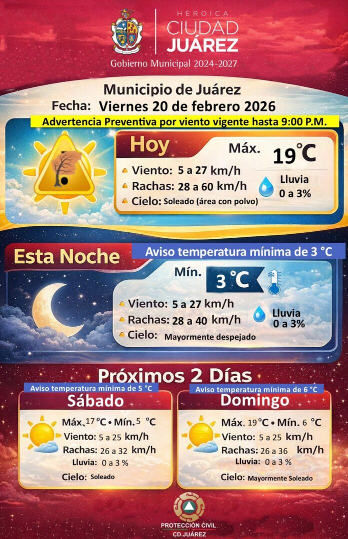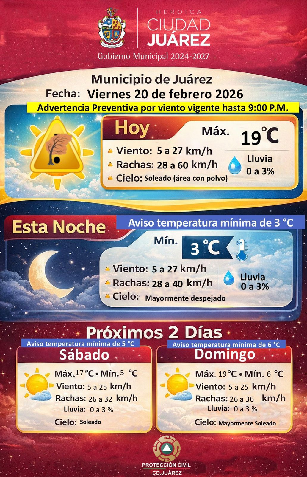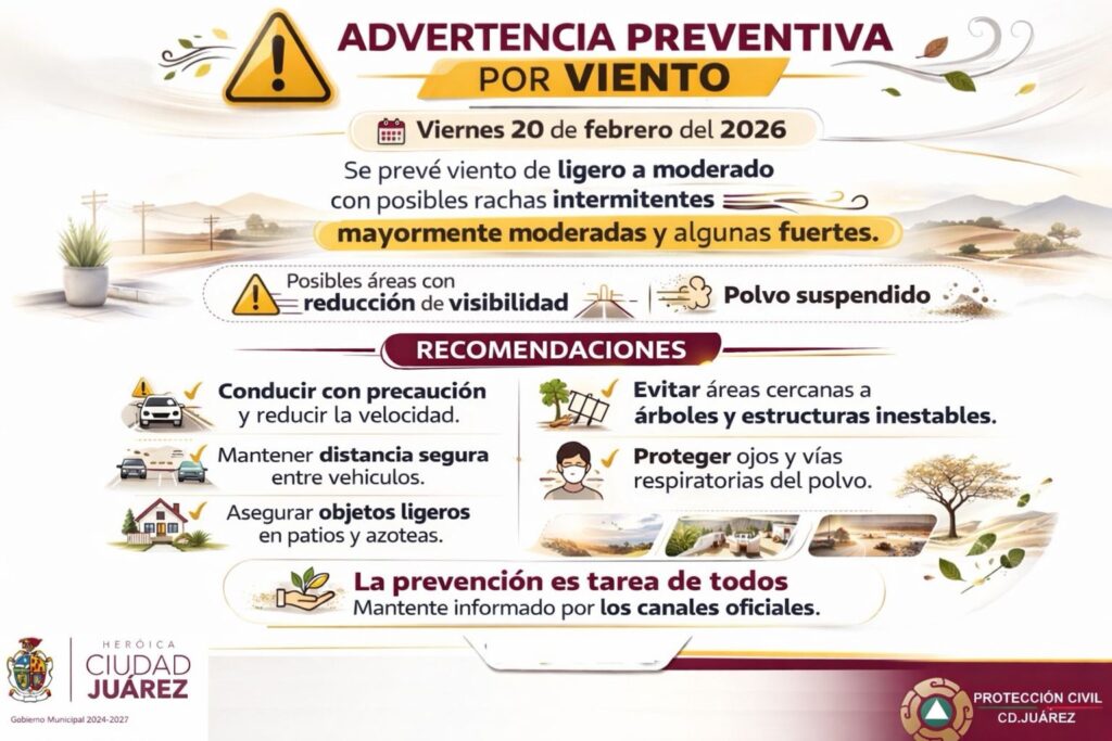 El Gobierno Municipal, a través de la Dirección General de Protección Civil, informó que este viernes 20 de febrero de 2026 se mantiene vigente una advertencia preventiva por viento hasta las 9:00 de la noche.