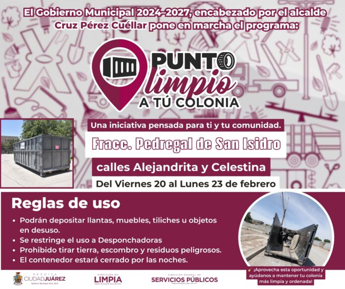 La Dirección de Limpia instaló desde ayer y hasta el lunes 23 de febrero, “Puntos Limpios a tu Colonia”, con el objetivo de acercar a los vecinos espacios adecuados para la disposición de tiliches y residuos de gran volumen.