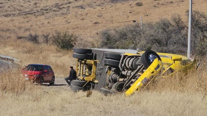 Su pesada unidad perdió la verticalidad y volcó sobre su costado izquierdo.