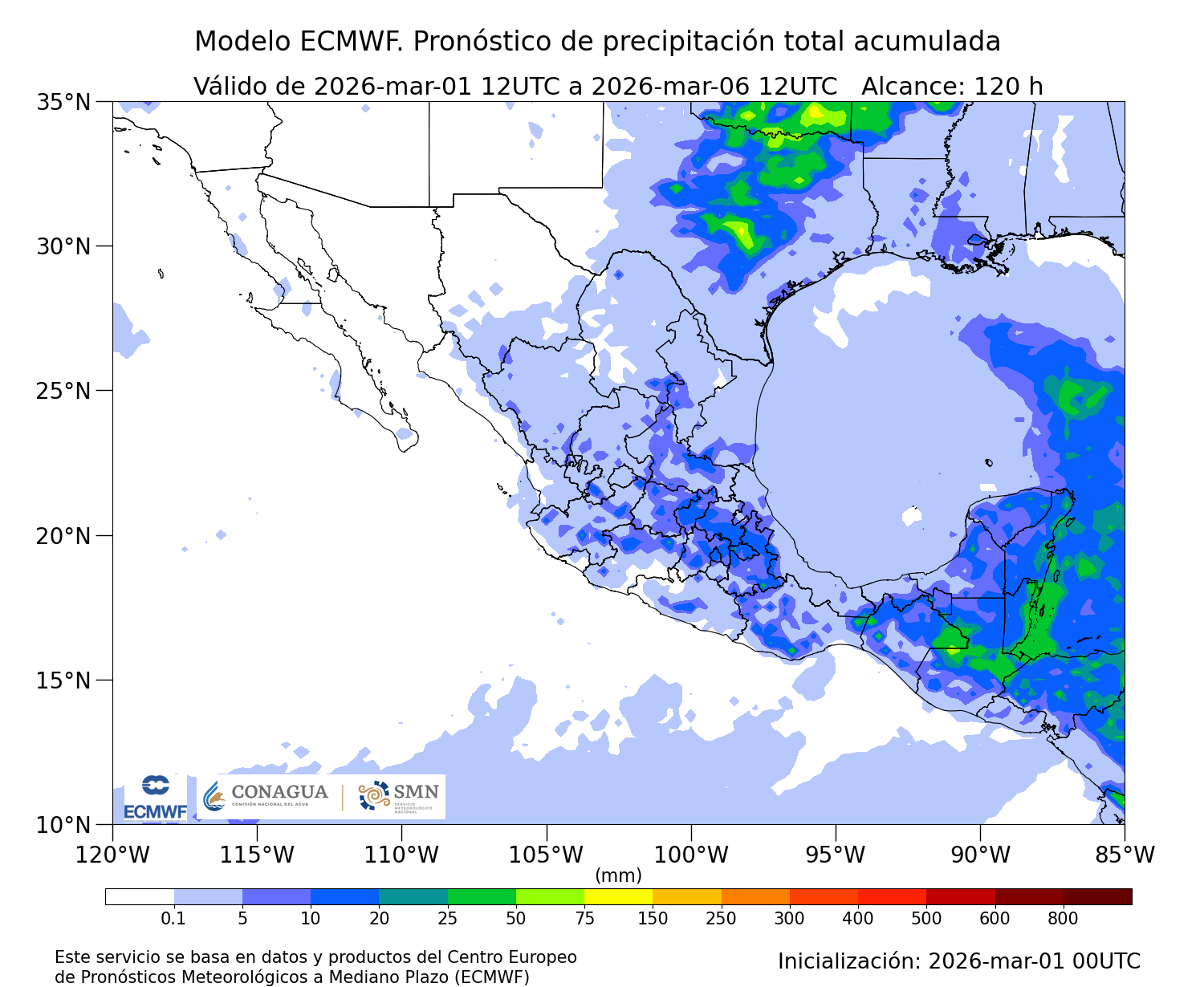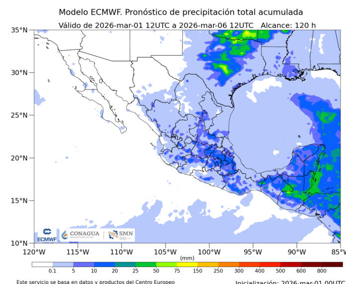 Canales de baja presión sobre el occidente, centro y sureste del territorio nacional, incluida la península de Yucatán, aunados a divergencia y el persistente ingreso de humedad proveniente del océano Pacífico, golfo de México y mar Caribe, ocasionarán lluvias y chubascos con posibles descargas eléctricas en las mencionadas regiones, además del norte del país, pronosticándose lluvias puntuales fuertes en Chiapas.