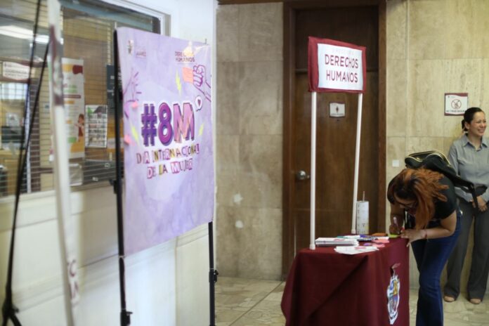 La Dirección de Derechos Humanos, instaló un módulo informativo en la planta baja de la Unidad Administrativa “Lic. Benito Juárez” (presidencia municipal) con la actividad denominada “Compromisos por el 8M”, en el marco de las acciones conmemorativas por el Mes de la Mujer.