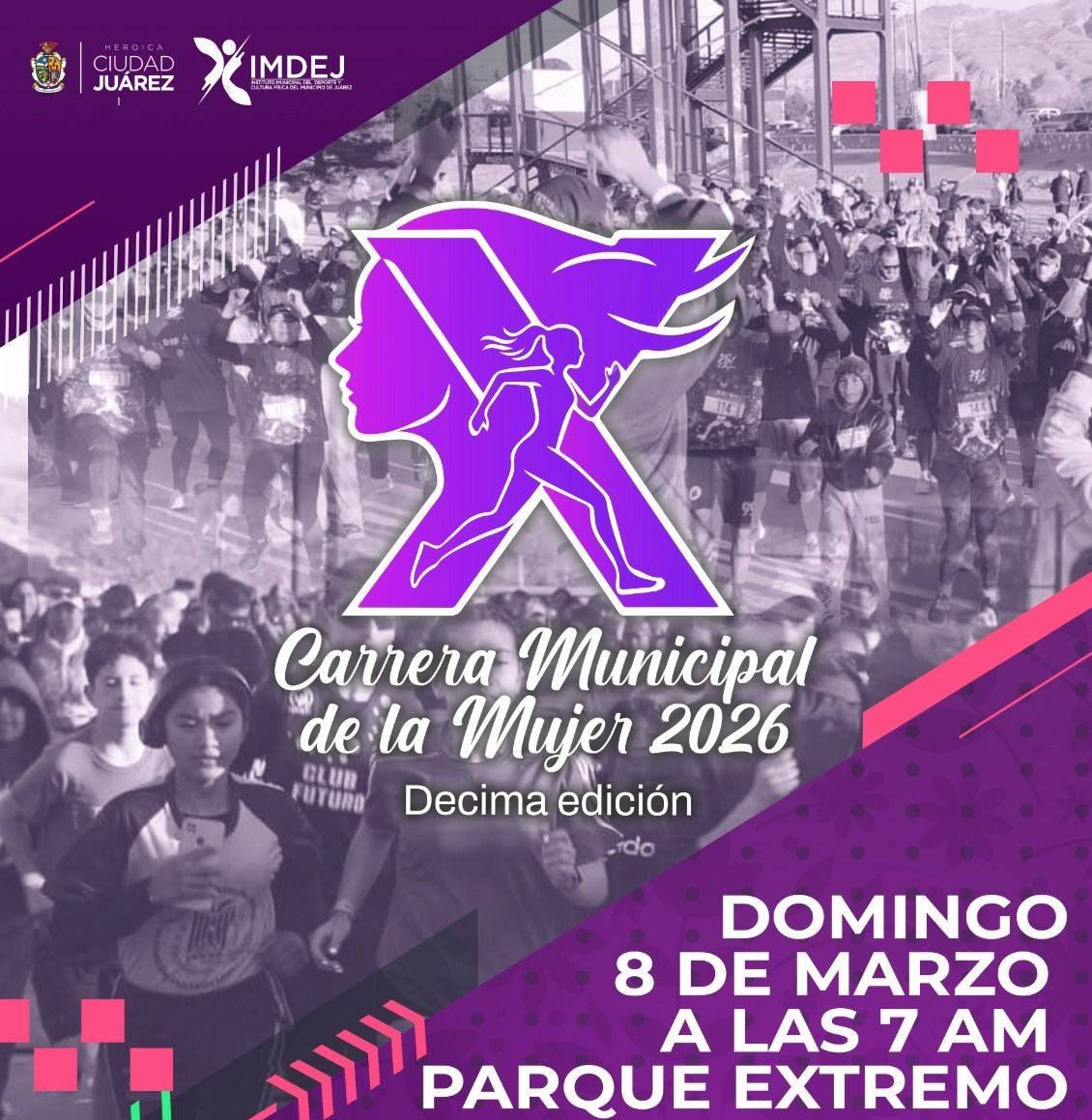 Continúan abiertas las inscripciones para la segunda fecha del Circuito Atlético Pedestre que se realizará este domingo 8 de marzo con la Décima Edición de la Carrera de la Mujer, evento organizado por el Instituto Municipal del Deporte y Cultura Física de Juárez y el Instituto Municipal de las Mujeres.