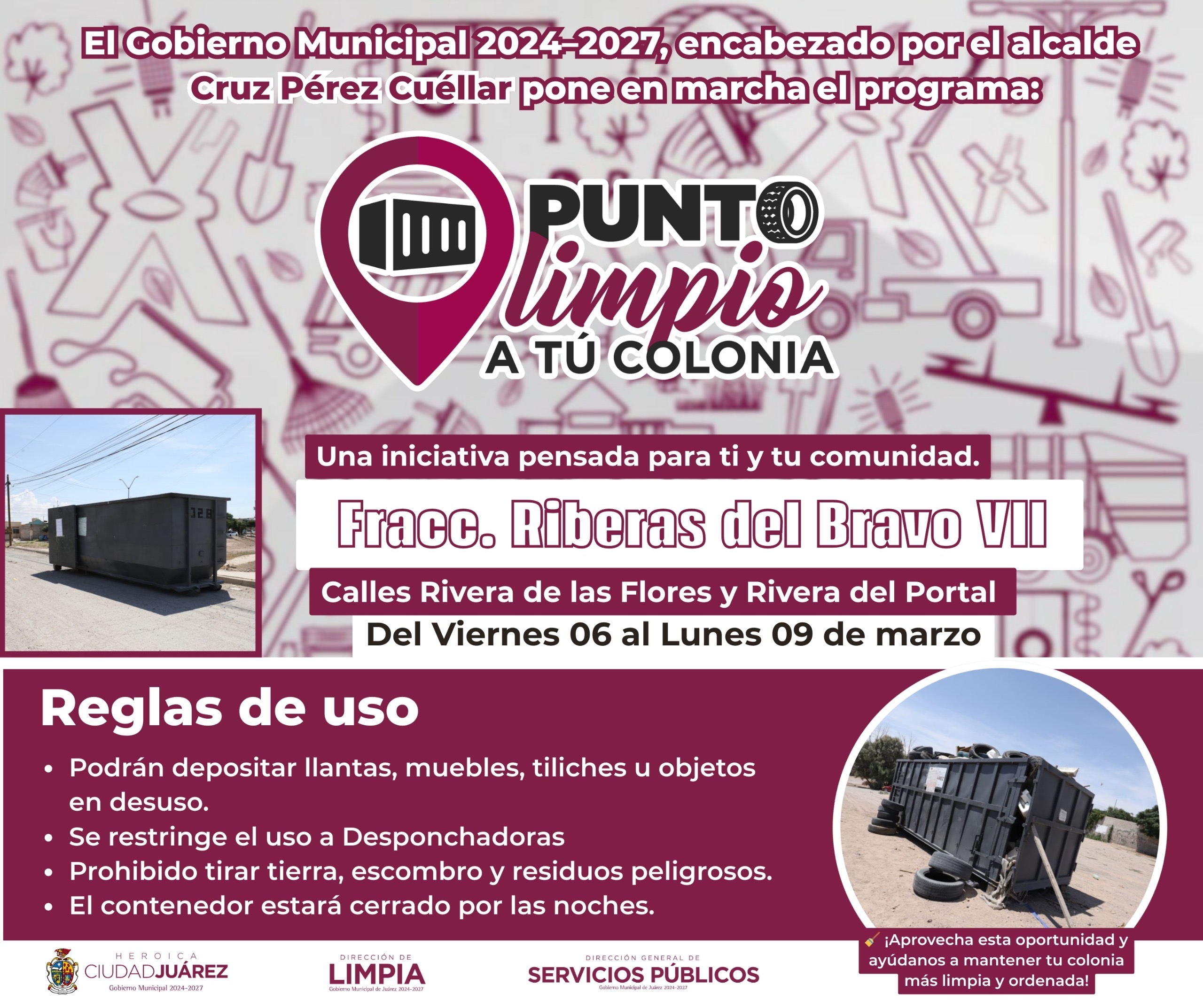 “Invitamos a todos los juarenses de estas colonias y sectores cercanos a que aprovechen la herramienta. Es un contenedor grande de 30 metros cúbicos, donde podrán depositar de manera práctica, gratuita y responsable tiliches, colchones, muebles dañados, tapetes, algunas llantas y otros objetos que ya no utilicen”, señaló.