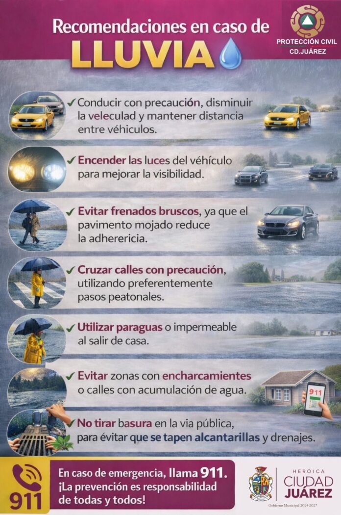 La Dirección General de Protección Civil informó que se mantiene la probabilidad de lluvias durante la noche de este lunes y hasta la tarde del martes en Ciudad Juárez, con variaciones en su intensidad y en las zonas donde puedan presentarse.