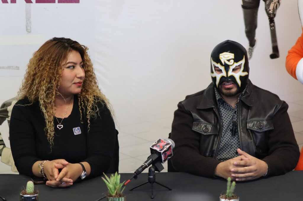 En la conferencia que se realizó en la sala de prensa del IMDEJ estuvieron el director del Instituto, Juan Carlos Escalante; Karina Roble en representación de la Cámara Nacional de Comercio; Nova Boy, vocero de Carrera Verde Juárez 2026; Ra, Dios Egipcio luchador y diseñador de JL Masks.