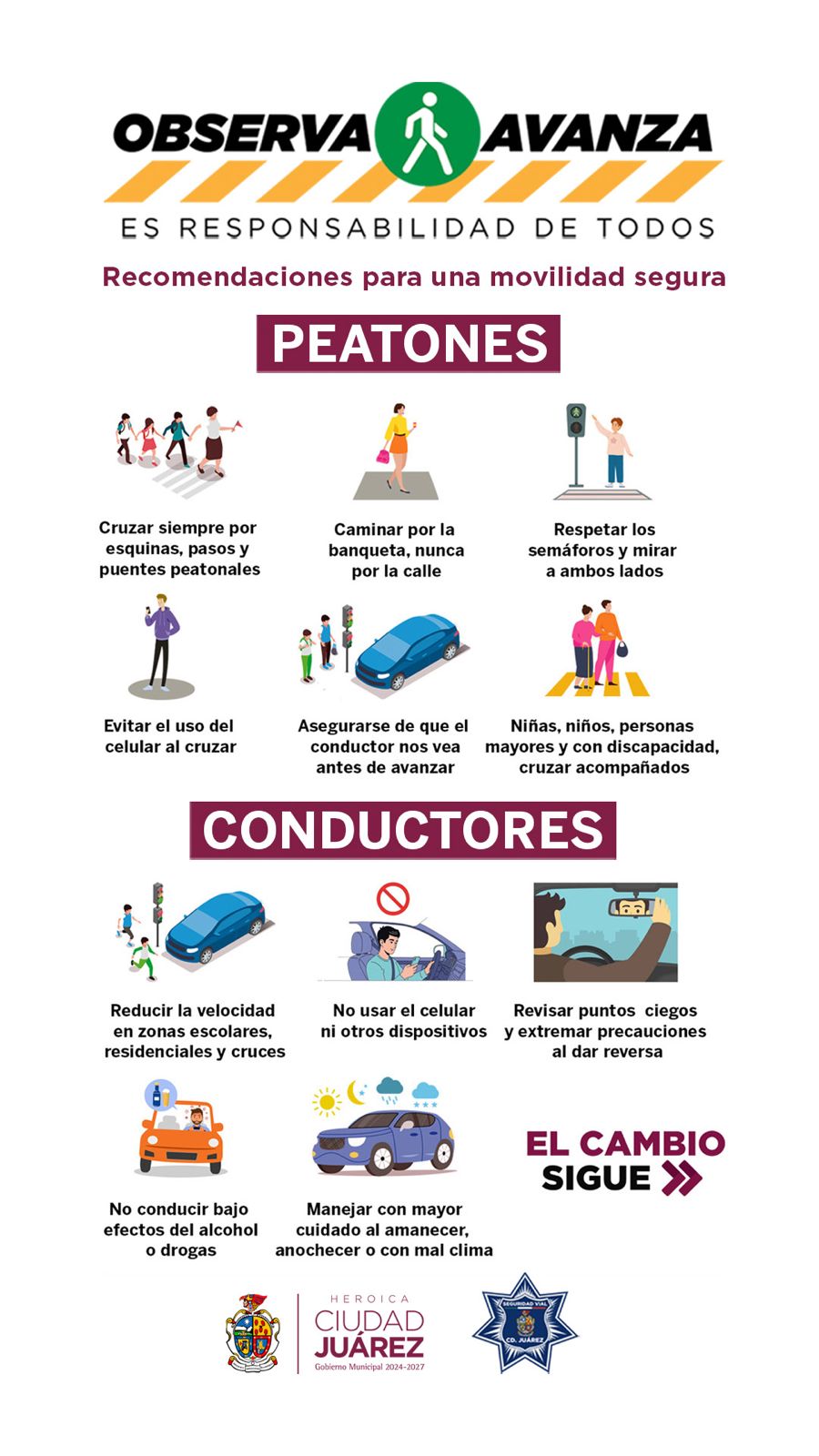 Con el fin de disminuir atropellos, la Coordinación General de Seguridad Vial, hace un exhorto a conductores y peatones, para que transiten con precaución; es por ello que a través de la campaña “Observa, avanza”, se emiten recomendaciones que buscan inhibir este tipo de incidencias, con apoyo de la ciudadanía.