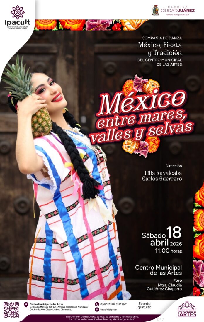 El Instituto para la Cultura del Municipio de Juárez (IPACULT) invita a la comunidad a disfrutar del espectáculo de danza “México: Entre Mares, Valles y Selvas”, a cargo de la Compañía de Danza del Centro Municipal de las Artes (CMA) “México, Fiesta y Tradición”, el cual se presentará este sábado 18 de abril a las 11:00 de la mañana en el foro Maestra Claudia Chaparro del CMA.