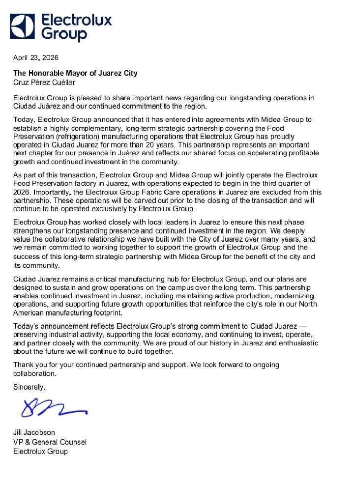 Valoramos profundamente la relación de colaboración que hemos construido con la Ciudad de Juárez durante muchos años y mantenemos nuestro compromiso de trabajar juntos para apoyar el crecimiento de Electrolux Group y el éxito de esta alianza estratégica de largo plazo con Midea Group, en beneficio de la ciudad y su comunidad, dice la carta de Jacobson.