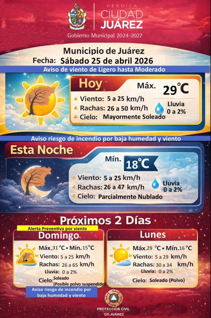 La Dirección General de Protección Civil del Municipio de Juárez informó que para este sábado 25 de abril de 2026 se esperan condiciones mayormente soleadas, con una temperatura máxima de 29 grados centígrados y vientos de ligeros a moderados.